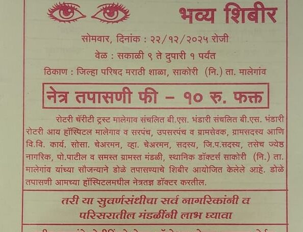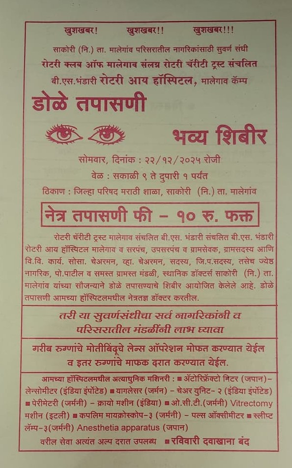 रोटरी क्लब मालेगाव सलग्न रोटरी आय हॉस्पिटल ,मालेगाव यांच्या संयुक्त विद्यमाने